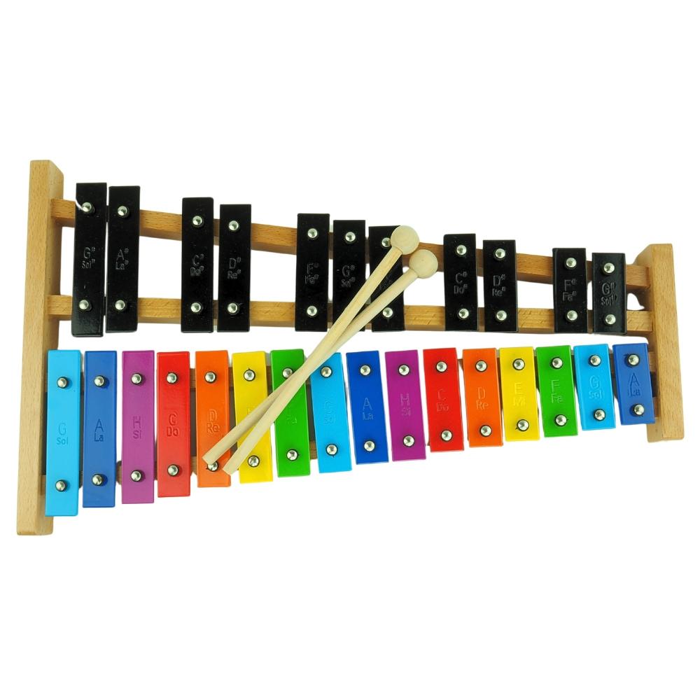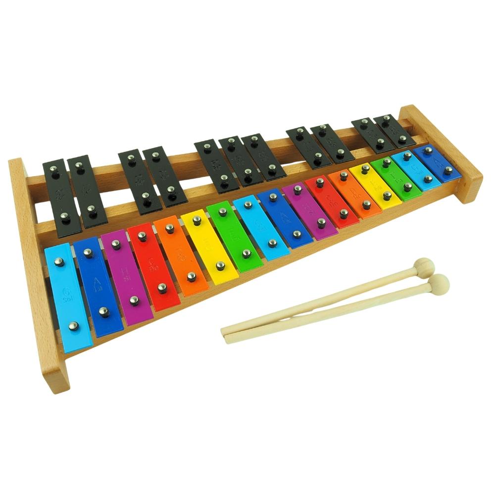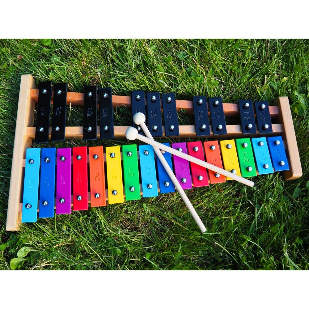 Układ podpisanych dzwiękami blaszek w pełnej skali chromatycznej dokładnie odzwierciedla klawiaturę fortepianu, pianina czy keyboardu – białe i czarne dźwięki. Dzięki temu dziecko, które opanuje grę na dzwonkach chromatycznych, łatwiej poradzi sobie z nauką gry na innych instrumentach klawiszowych.