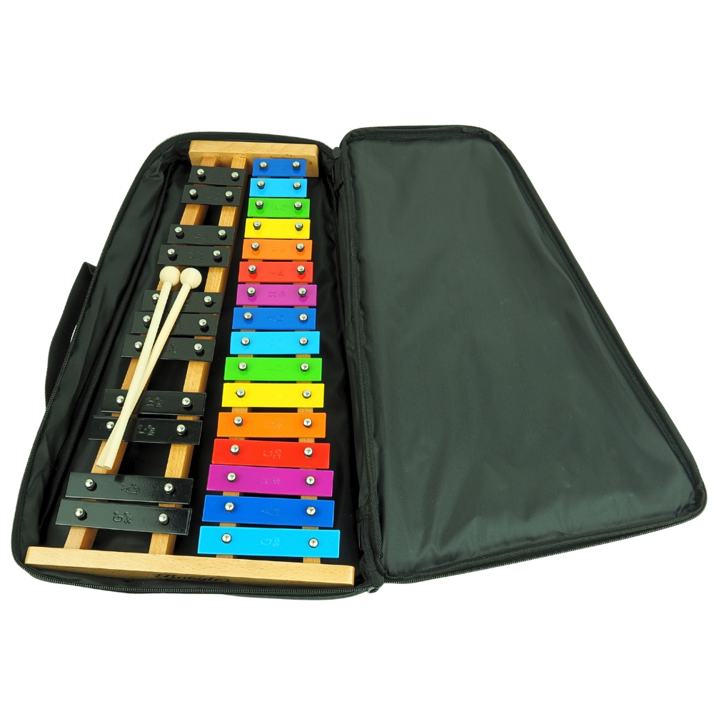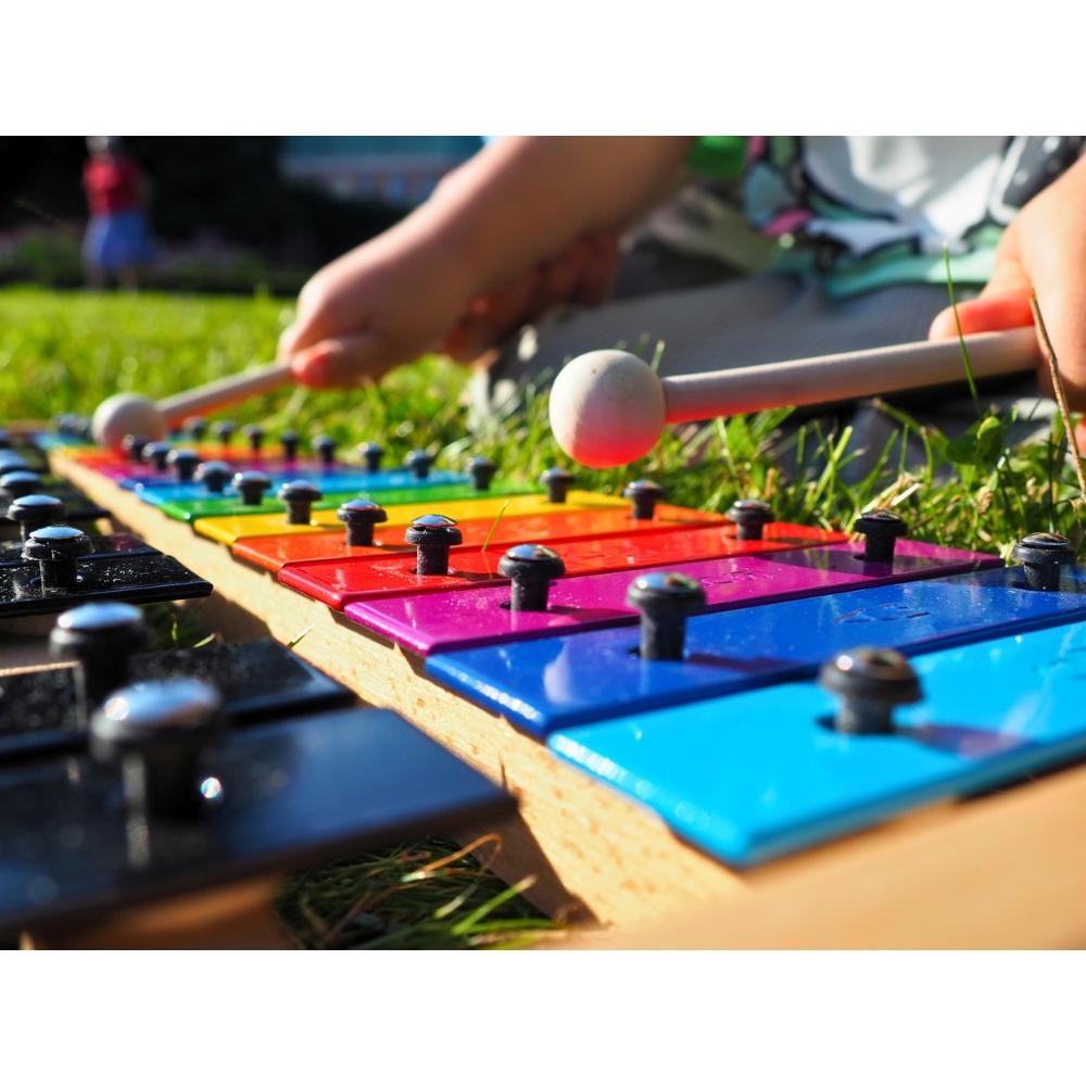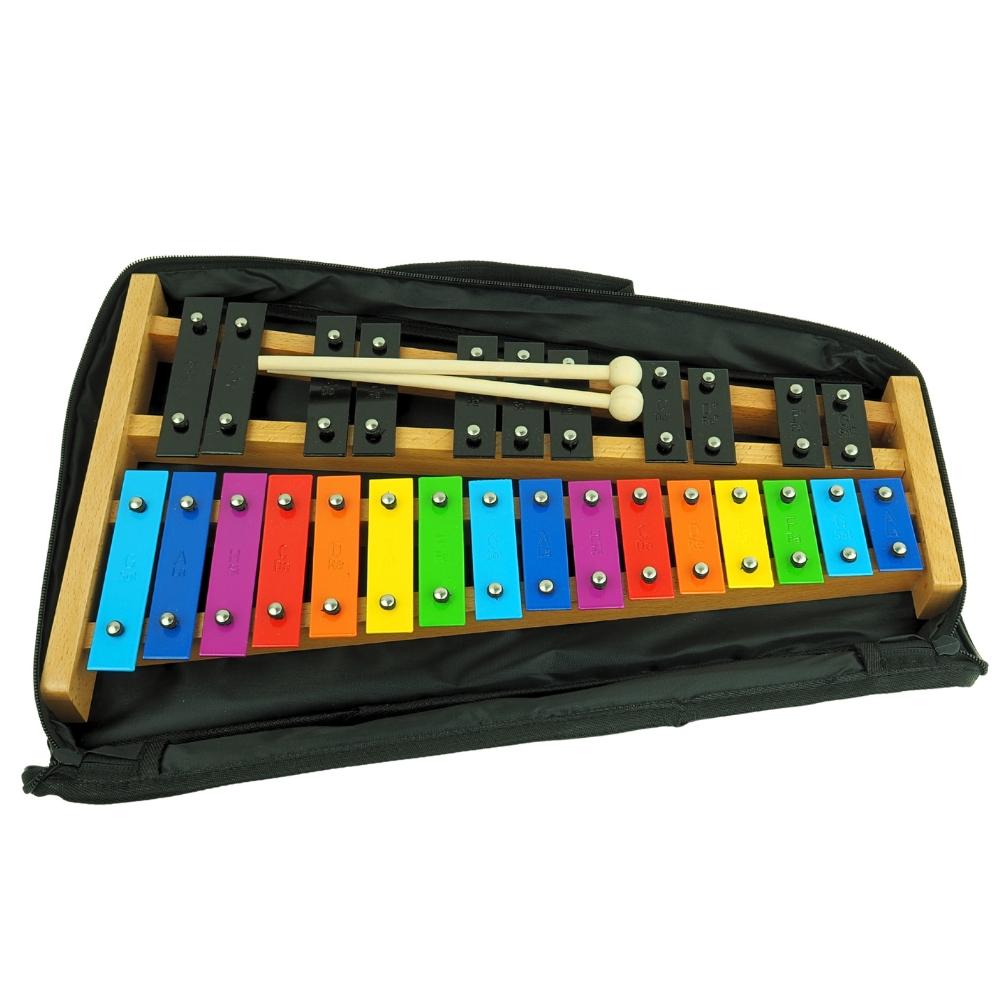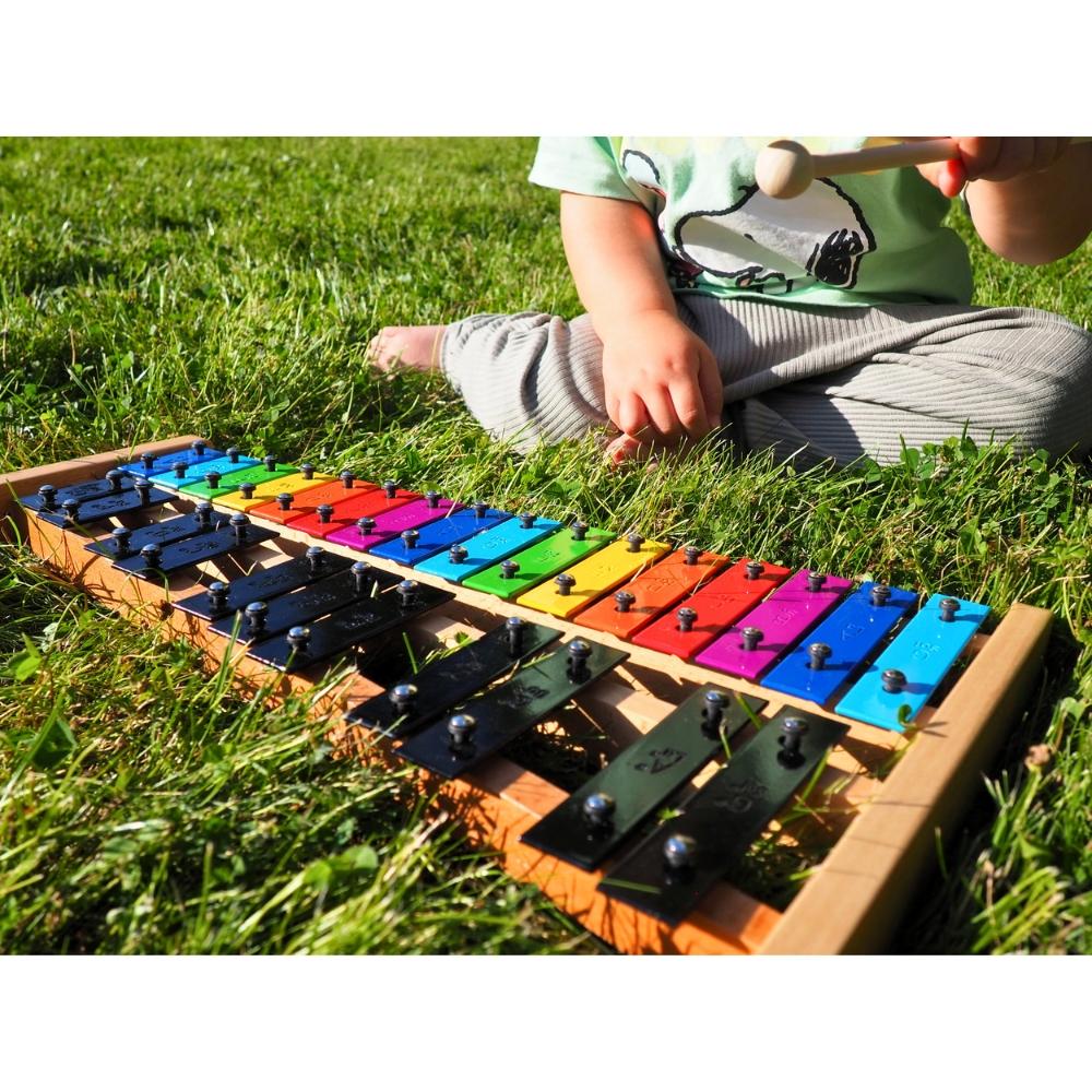 Układ podpisanych dzwiękami blaszek w pełnej skali chromatycznej dokładnie odzwierciedla klawiaturę fortepianu, pianina czy keyboardu – białe i czarne dźwięki. Dzięki temu dziecko, które opanuje grę na dzwonkach chromatycznych, łatwiej poradzi sobie z nauką gry na innych instrumentach klawiszowych.